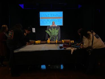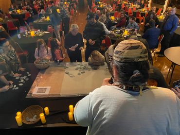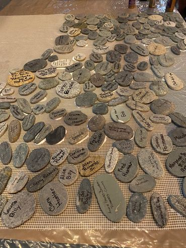 On October 13, 2025, Indigenous Peoples' Day, community members gathered to write the names of their Taa-laa-wa dee-ni' ancestors on the pebbles for the Welcome Station pebble mosaic before they were set in concrete. These names have now become a permanent part of the exhibit.